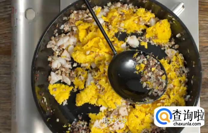 翻炒均匀后,再加入虾仁、鸡肉、鸭胗、笋丁和香菇,开到大火,接着再倒入米饭,将锅里的食材一起翻炒,直至各种食材均匀地融合在一起。