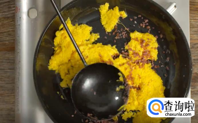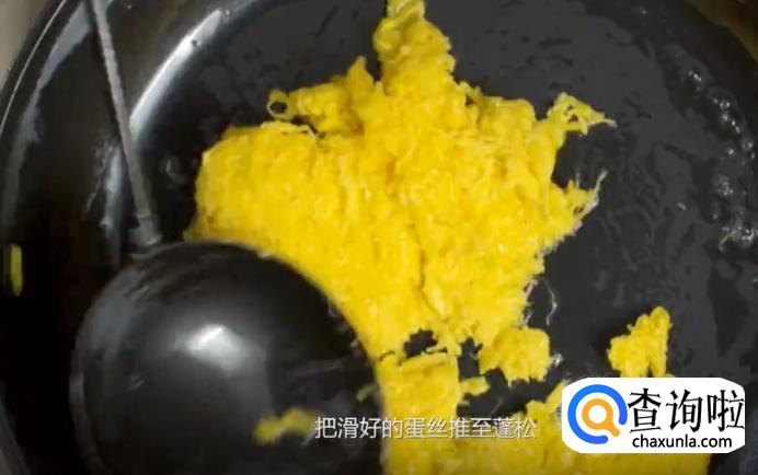 接下来,利用平底锅的余温,把滑好的蛋丝推至蓬松,再倒入火腿,炒一下。