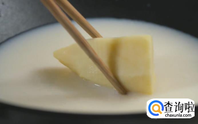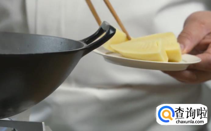 烧一口锅,将鸡高汤倒入进去,再加入汆好的笋片,用小火微煮,使鸡汤内的鲜香渗到笋里面。煮好后将笋捞出。