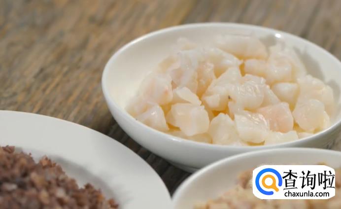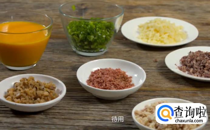 接着,把花菇、笋、鸭胗、火腿和鸡肉等配料切成米粒大小的样丁,放在盘中备用。