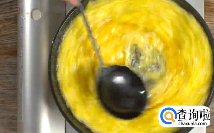 现在先炒蛋丝。在平底锅内倒入400克左右的油,待油温达到90度左右的时候,一边慢慢地倒入蛋液,一边用勺子不断地打圈搅动。
