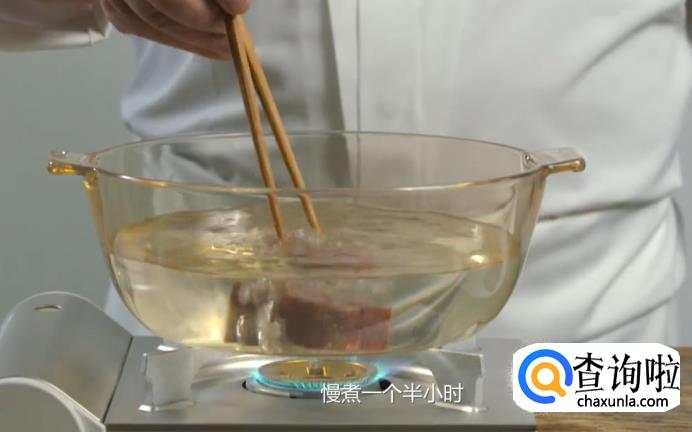 我们在锅里倒入适量的水,待水烧开之后,将火腿放进去慢煮90分钟,弱化它的咸味。煮好之后,将火腿捞出,放在一旁备用。