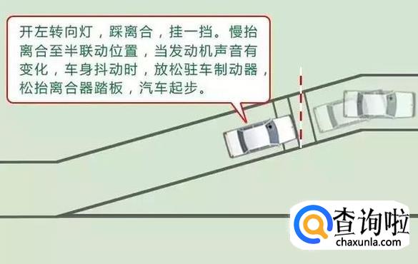 4、起步前,挂1挡、打左转向灯、按一下喇叭;