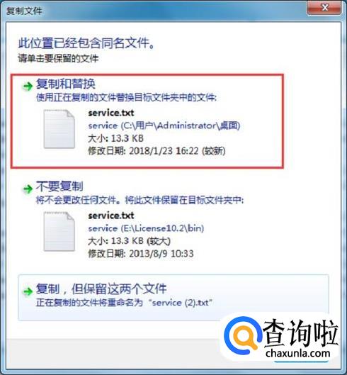 将自己用注册机做好的service.txt文件复制进入bin文件夹内,因为bin文件夹内原本存在一个service.txt文件,这时就会出现一个提醒页面,点击复制和替换选项即可。