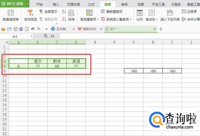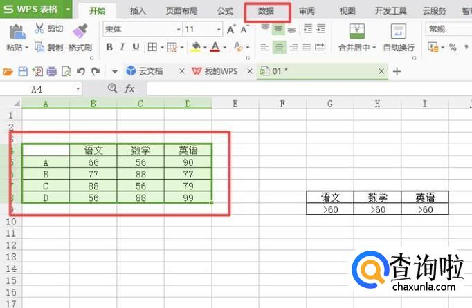 之后我们选中图示中的区域,然后我们点击数据;