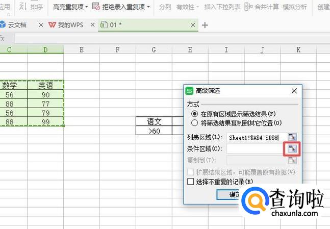 弹出的界面,我们点击条件区域的引用符号;