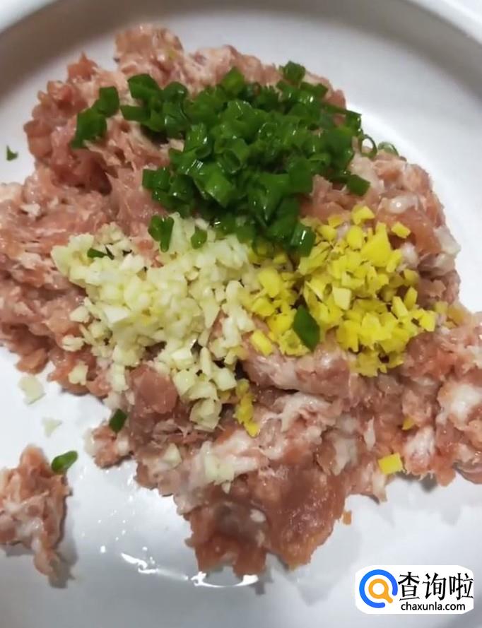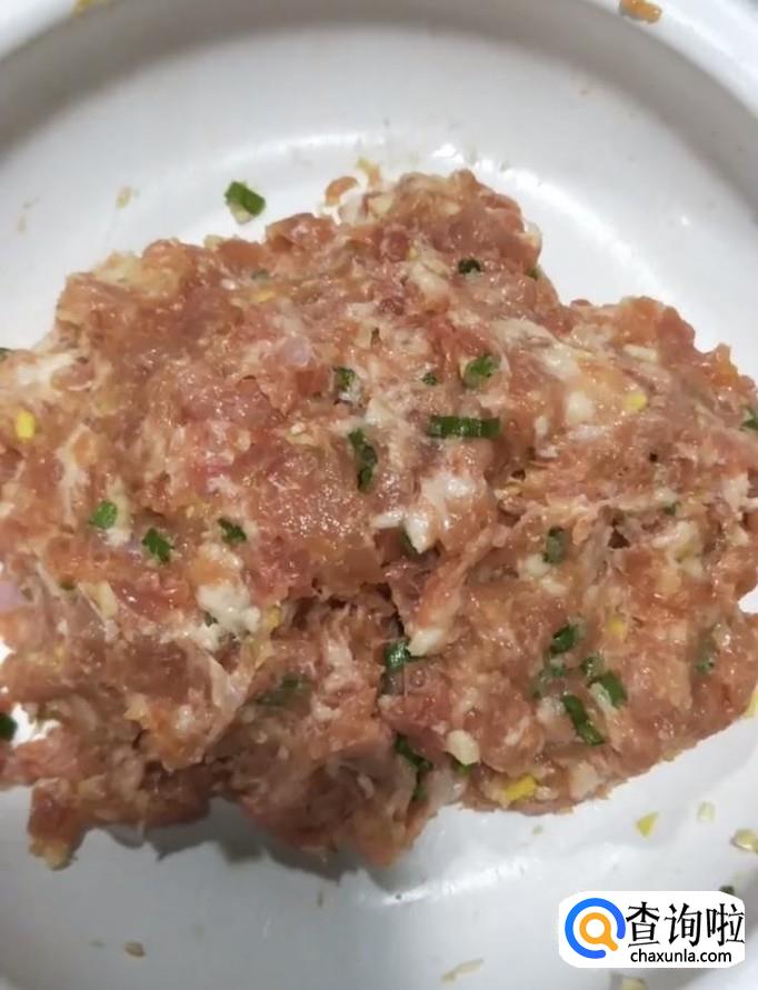 首先我们将肉泥放入一个盆中,放入切好的葱姜蒜末