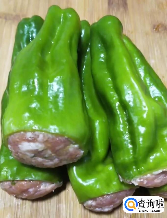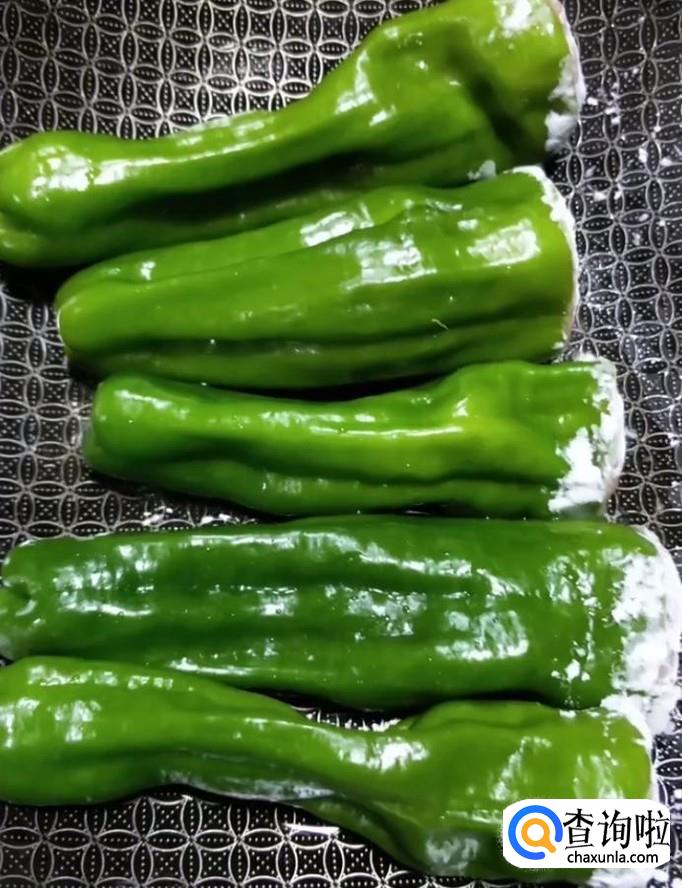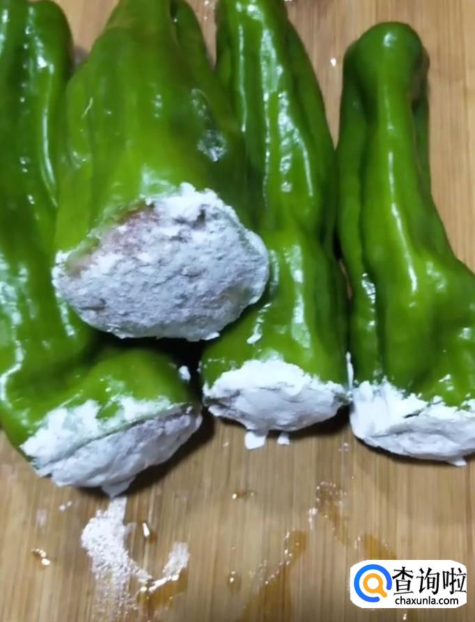 接着我们把调好的肉馅塞入青椒中,沾一层淀粉如图所示