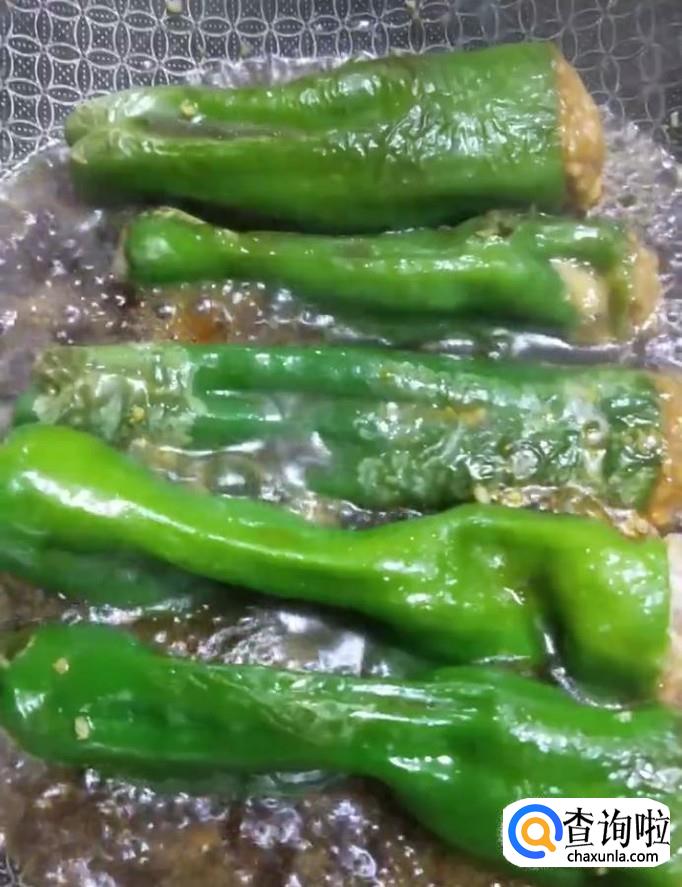 然后我们锅中加入适量的油,油温五成热下入青椒肉末,煎至虎皮状捞出备用