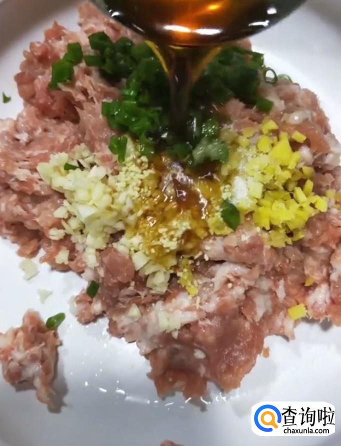 肉泥,葱姜蒜,盐,鸡精,黄酒,淀粉,青椒,蚝油,水,生抽,老抽