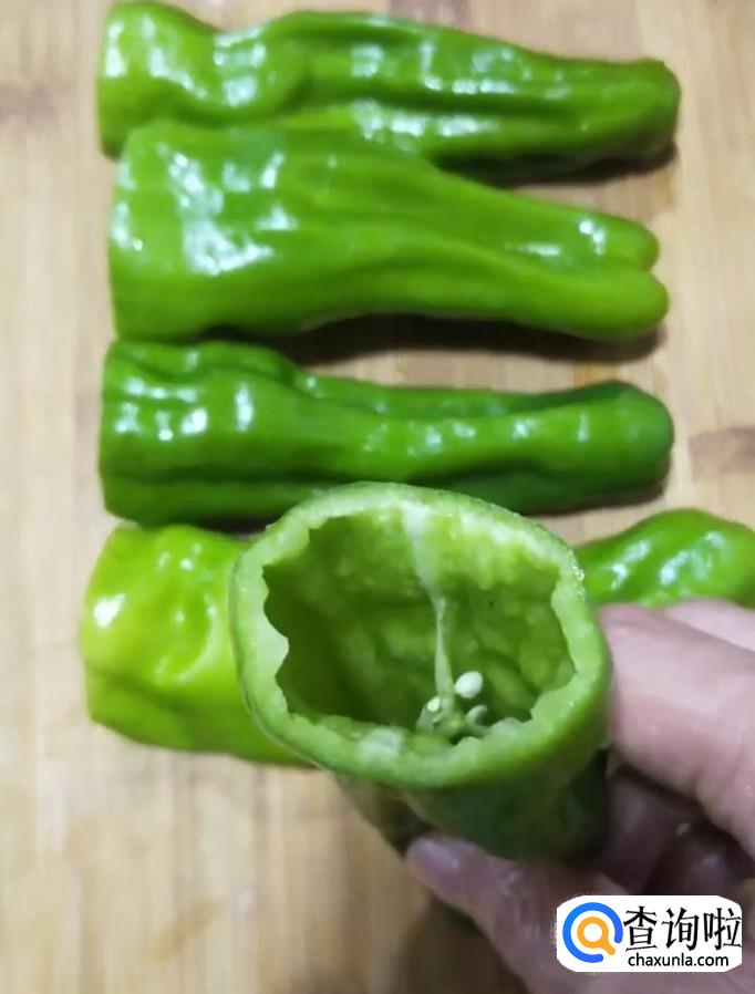 然后我们将青椒清洗干净,切除头部,取出里面的籽
