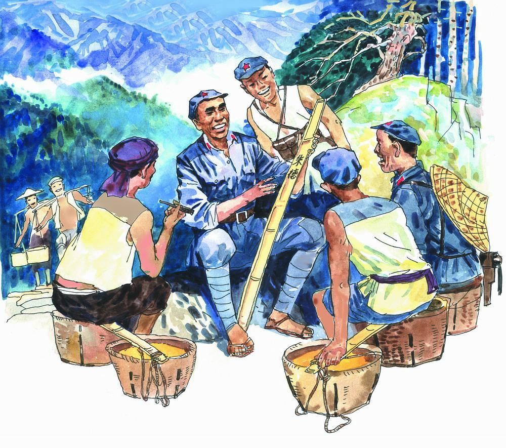 2、1928年,朱德同志带领一支红军队伍到井冈山跟毛主席会师。山上是红军,山下不远就是敌人。井冈山上出产粮食不多,常常要抽出一些人到山下的茅坪去挑粮。从井冈山上到茅坪,来回有五六十里,山高路陡,非常难走。可是每次挑粮大家都争着去。 朱德同志也跟战士们一块儿去挑粮。他穿着草鞋,戴着斗笠,挑起满满的一担粮食,跟大家一块儿爬山。白天挑粮,晚上还常常整夜整夜地研究怎样跟敌人打仗。大家看了心疼,就把他那根扁担藏了起来。不料朱德同志又找来了一根扁担,写上“朱德扁担不准乱拿”八个大字。大家见了,越发敬爱朱德同志,不好意思再藏他的扁担了。