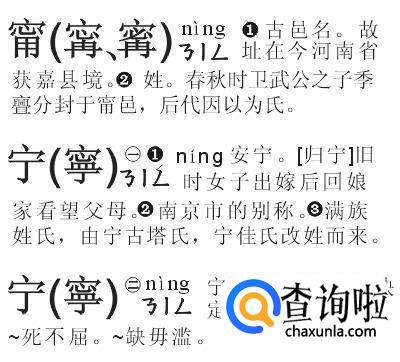 读音níng,多引自古文《水经注》中“武王伐纣,勒兵于甯,更名甯曰修武,”含义古代邑名,城市之名。又《王莽传》中“永以康甯”,含义为安宁之意。