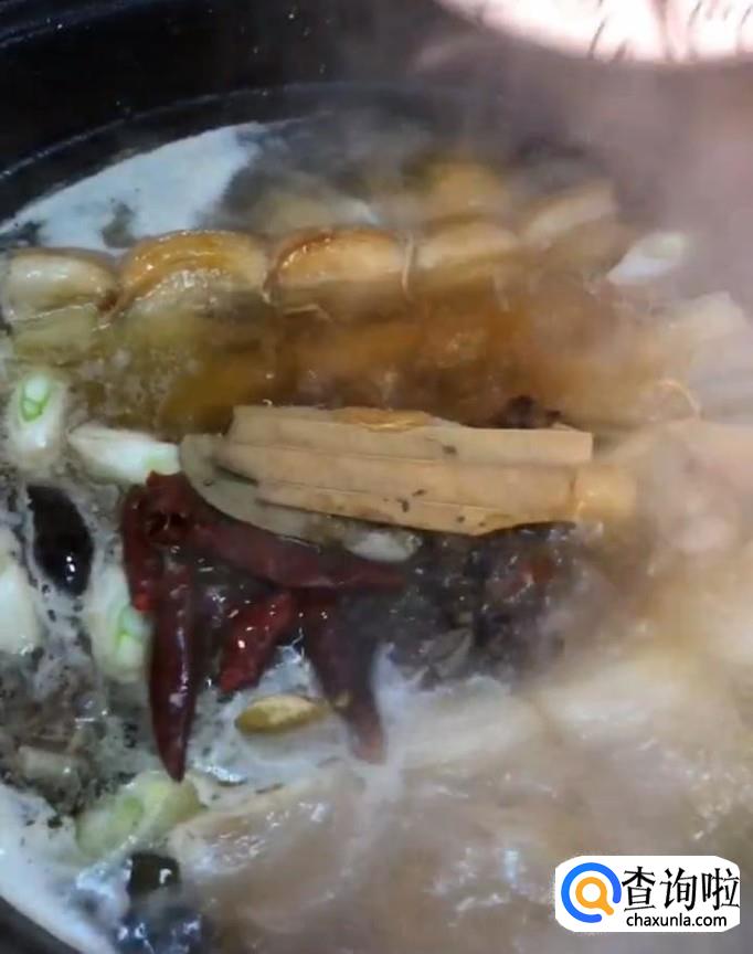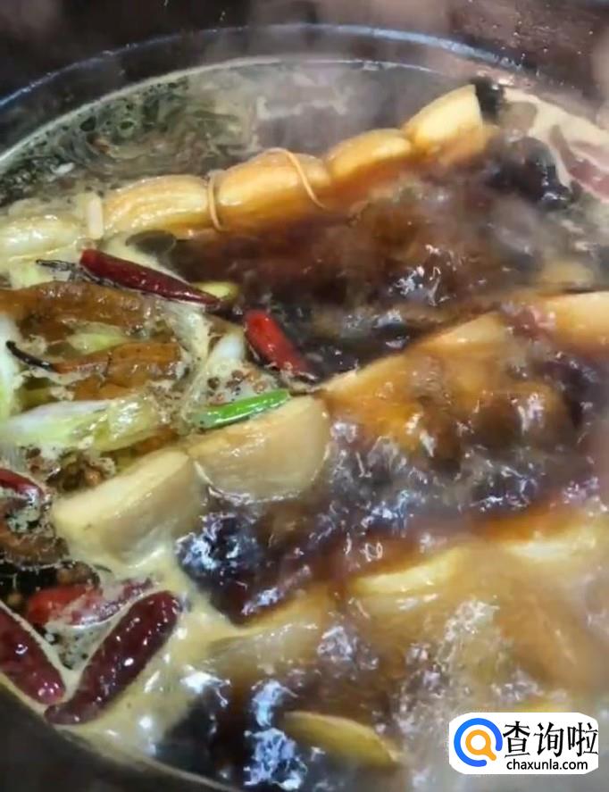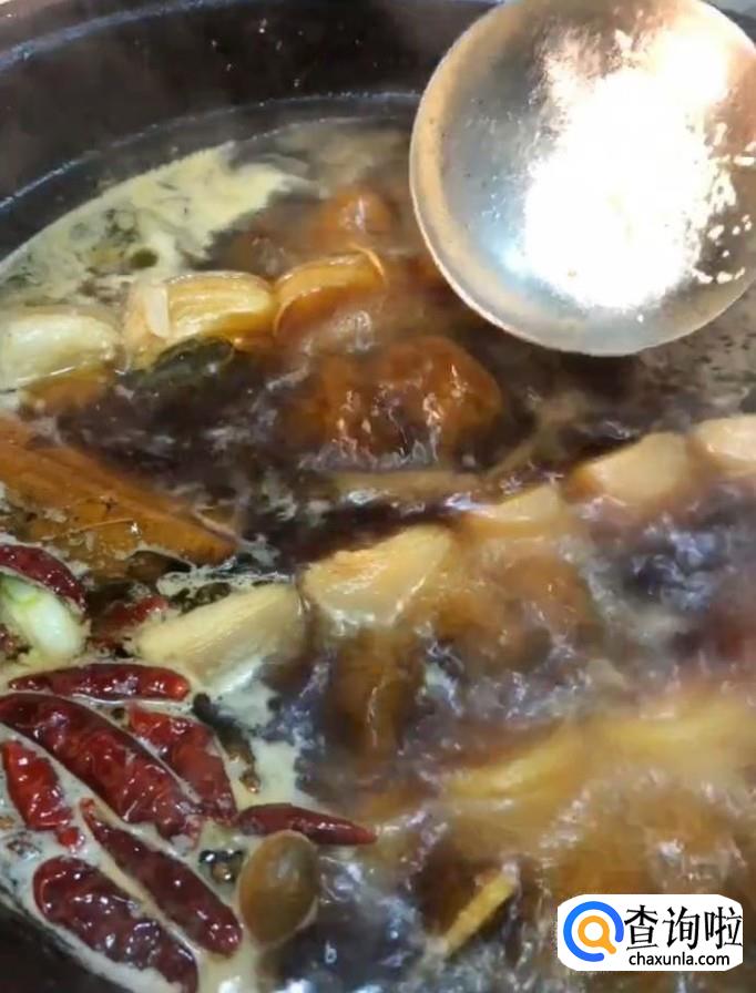然后我们放入葱姜,八角,桂皮,香叶,干辣椒,麻椒,再放入适量的蚝油,生抽,老抽,盐,鸡精,炖一个半小时关火