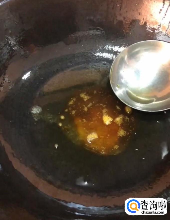 接着我们在锅中放入少许油,放几块冰糖,炒至焦糖色放入五花肉,倒入适量的清水,刚刚没过五花肉即可