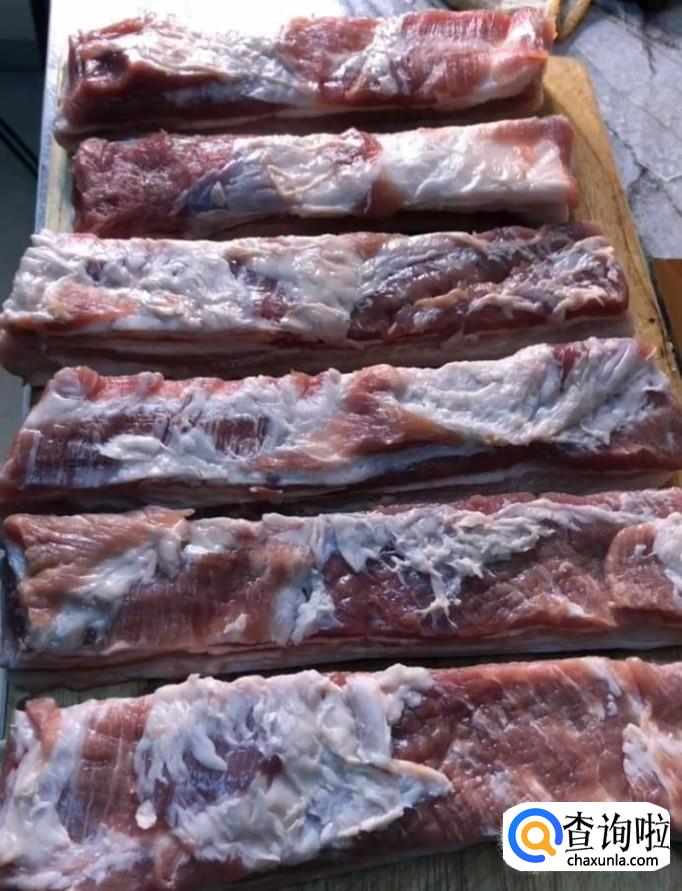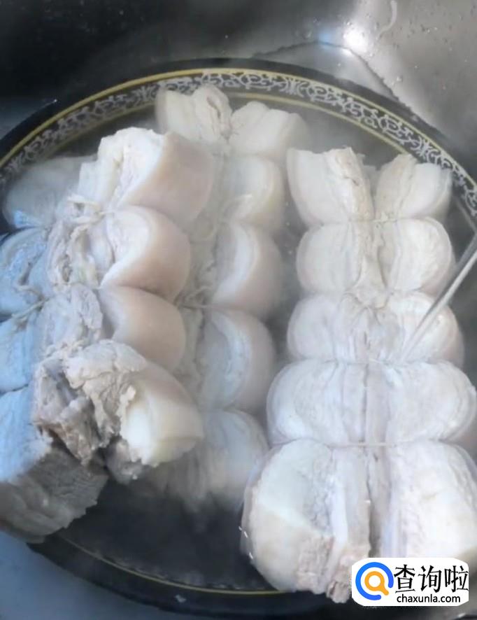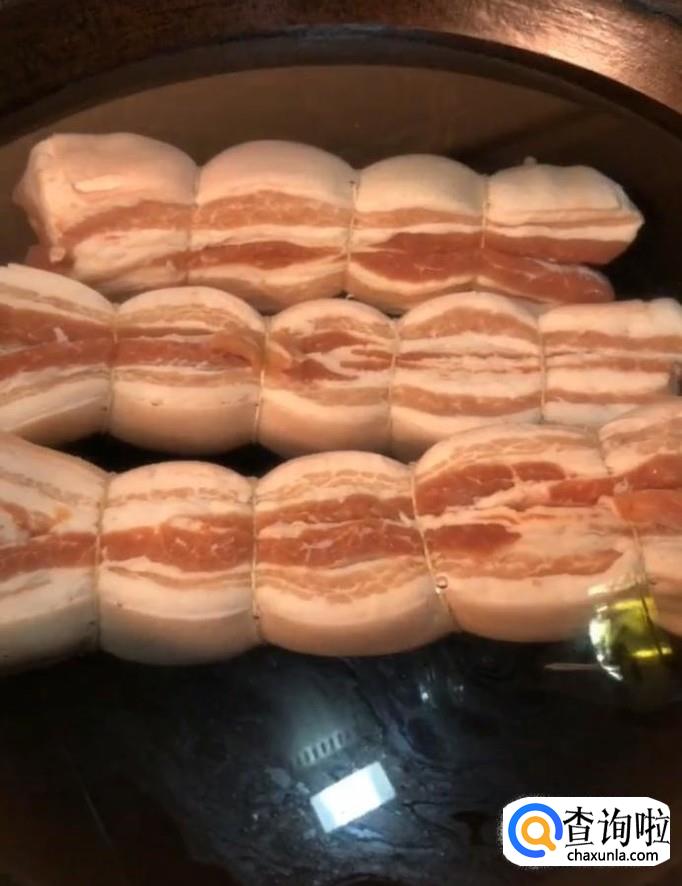 首先我们将五花肉切成大块,然后用麻绳将两块绑在一起如图所示