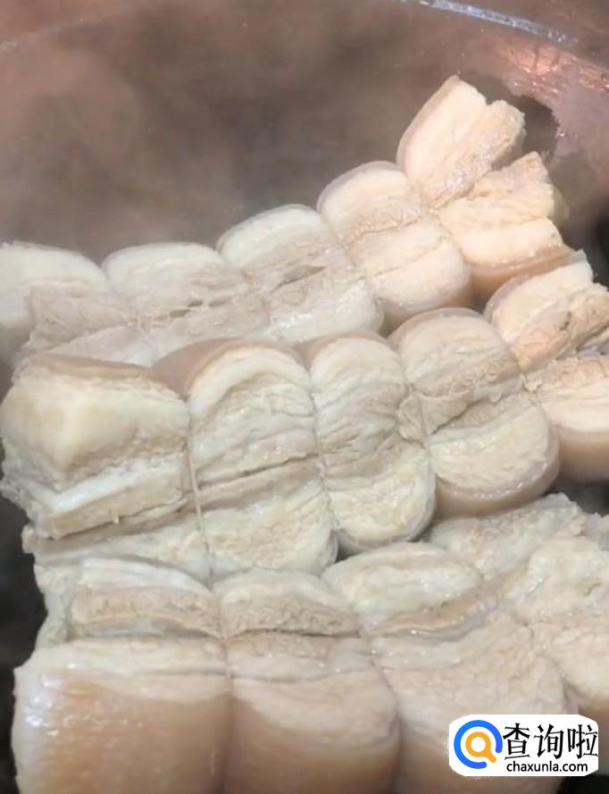 然后我们将五花肉放入冷水锅中,加入适量的料酒,煮出血沫,捞出冲洗干净备用