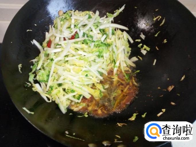 放入大白菜大火快速翻炒。大白菜炒至七分熟时,用勺把大白菜推向锅边,然后放入一匙儿酱油(酱油不要淋在白菜上),酱油爆出香味后,放入粉丝翻炒。