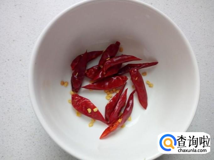 红干椒用水清洗干净,控干水分,斜刀切成对半。