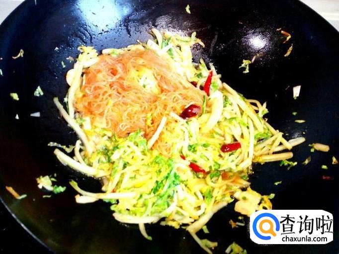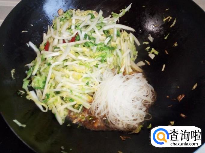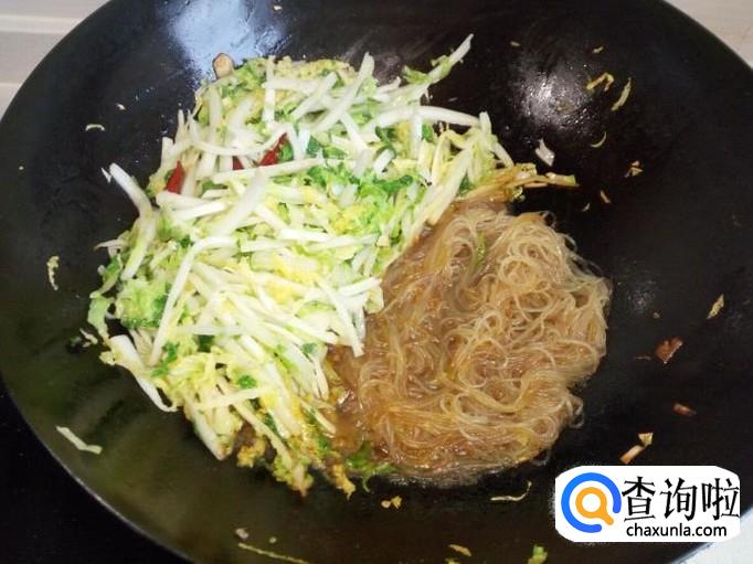 炒至粉丝吸附汤汁后,放入少许盐,把大白菜和粉丝混在一起,略翻炒一下。再放入味精,关火出勺。