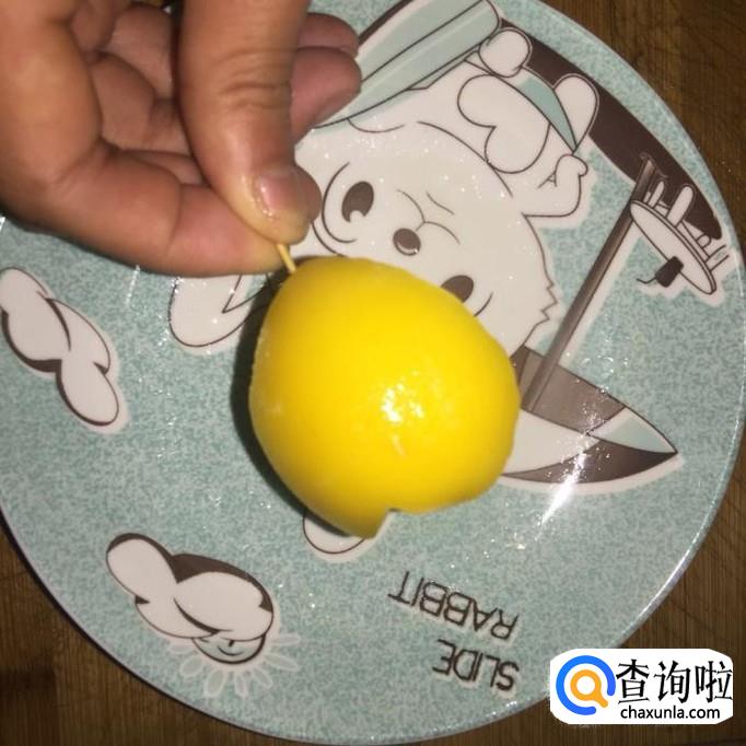 接着在这个爱心黄桃上插一根牙签,如下图所示。