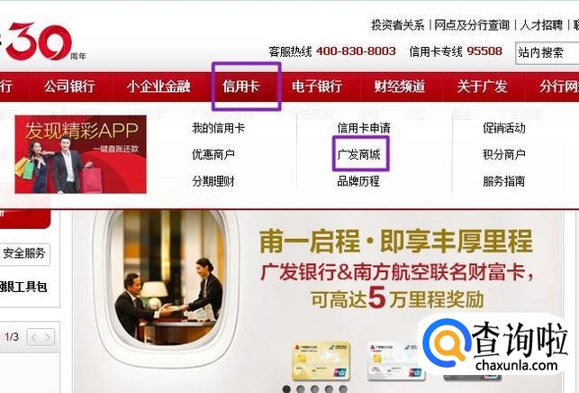 进入官网后,我们将鼠标放在信用卡处,弹出的界面,我们点击广发商城;