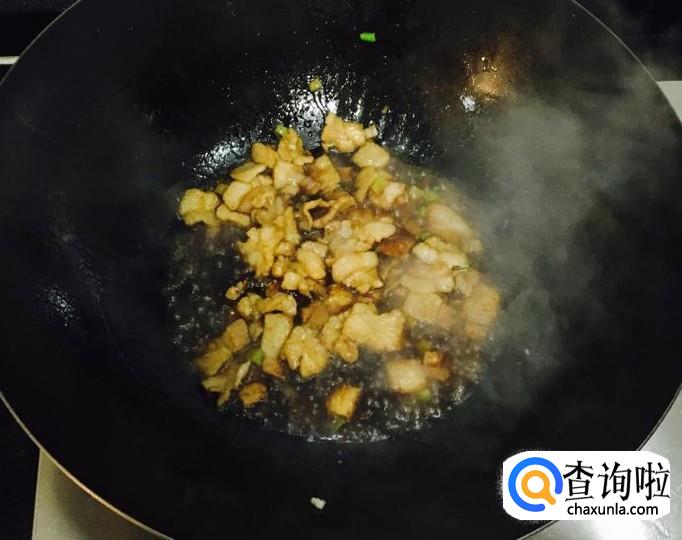 热锅加入适量的花生油把五花肉片炒香,放入葱花爆香,倒入适量的料酒和生抽煸炒一下