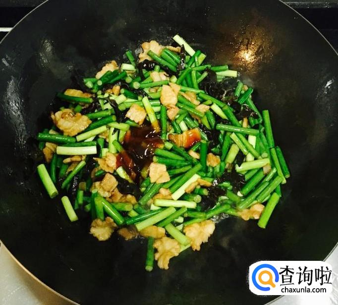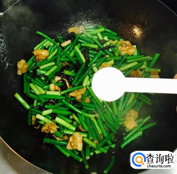炒至蒜苔断生后加入适量的盐调味儿并且翻炒均匀即可出锅