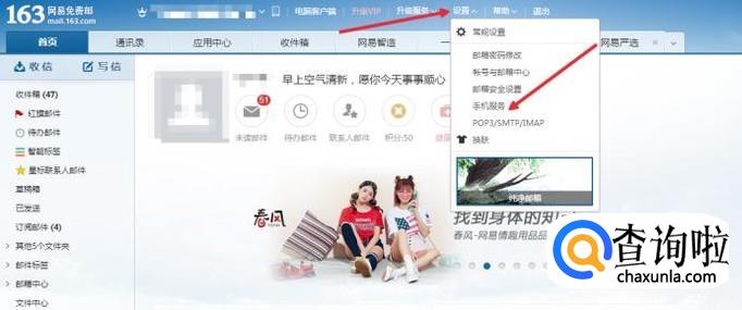 在网易邮箱首页面中,找到设置功能中的“手机服务”。