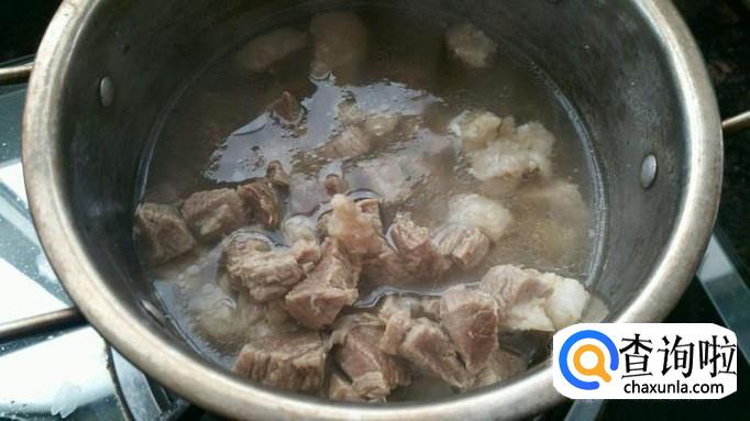 先把羊肉放在干净的冷水中浸泡两个小时,中间换一次水,然后再把羊肉切成块状。