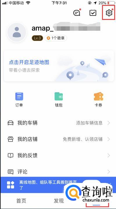 进入高德地图,在【我的】界面,点击右上角【设置】图标。