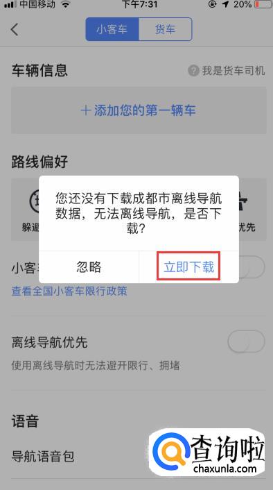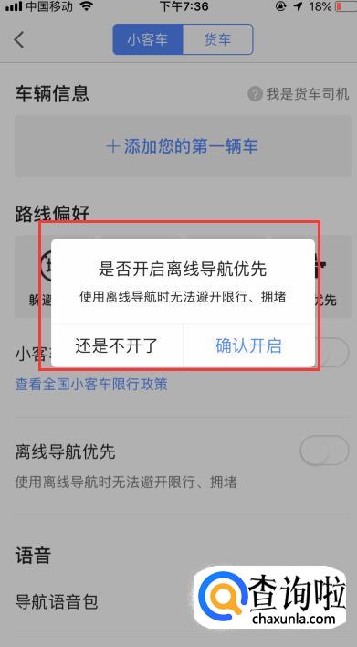 点开【离线导航优先】按钮,在弹出的窗口中点击【确认开启】。若还未下载离线导航数据,需先下载,下载后再点击【确认开启】。