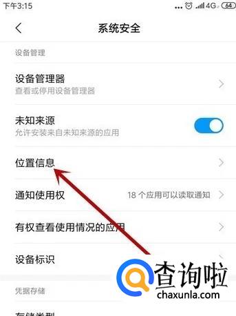 进入【系统安全】后,点击【位置信息】选项。
