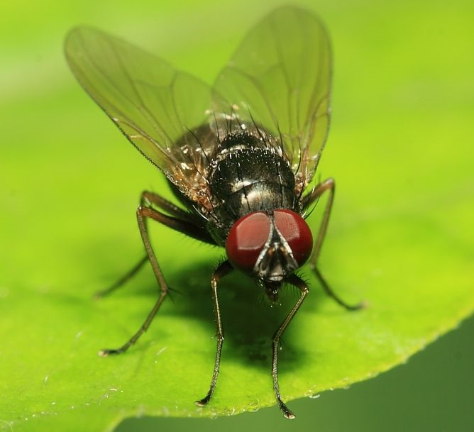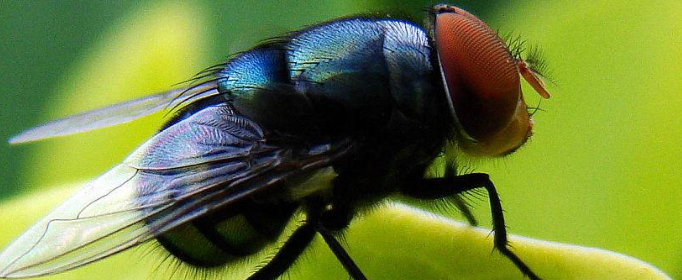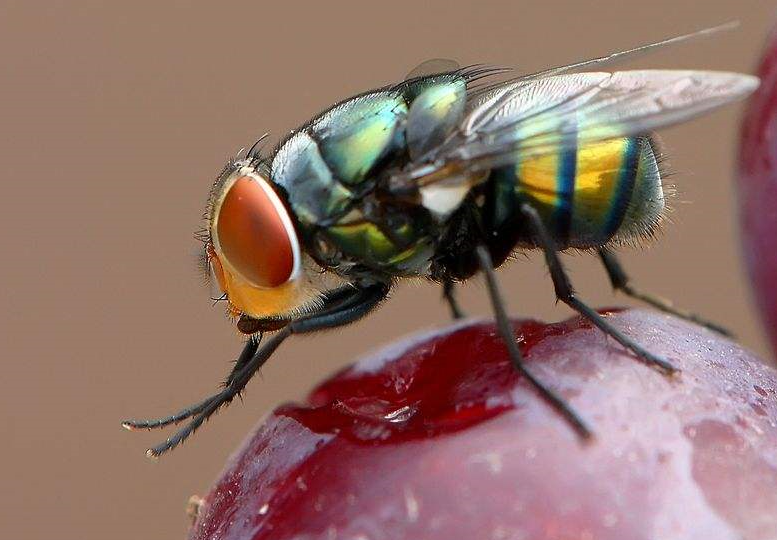 苍蝇六条腿的末端生有跗节,用来抓住所攀附的物体表面。相比于苍蝇的身体尺寸来说,它的体重并不大,所以苍蝇只需要很小的力量就能抓住天花板 不掉下来。如果你有一只高倍率放大镜,就能用它看到苍蝇腿上长有一组爪子,爪子底端还生有海绵状的脚垫,这些脚垫看上去像褶皱的炸土豆片,能使脚底更牢 地附着于物体表面。