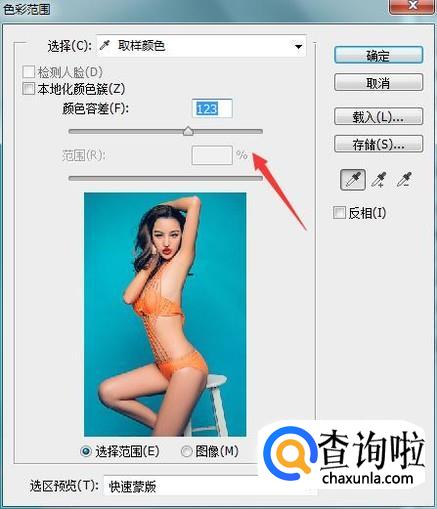 点击色彩范围选项,在弹出的对话框内使用吸管工具吸取背景色,然后设置颜色容差如图所示: