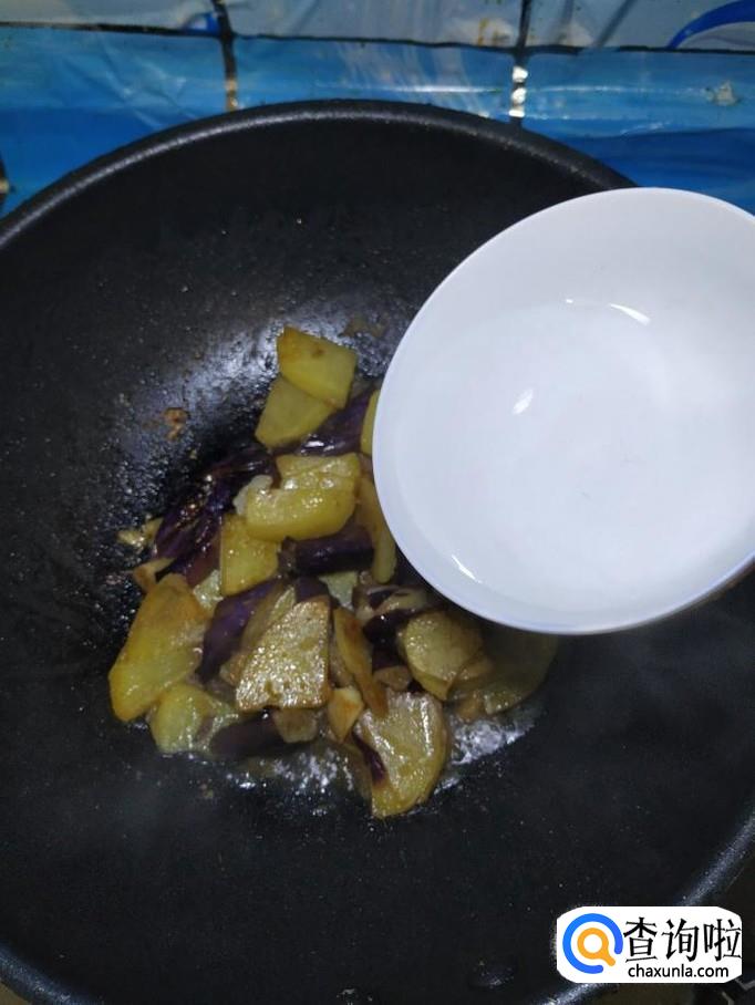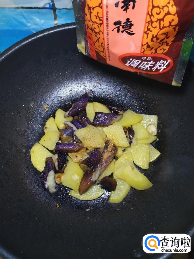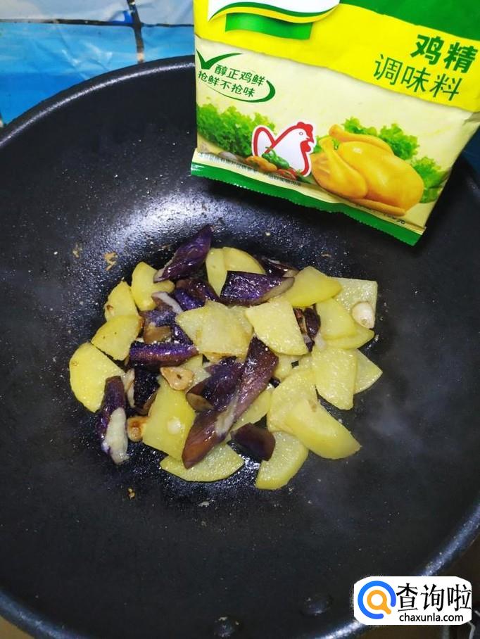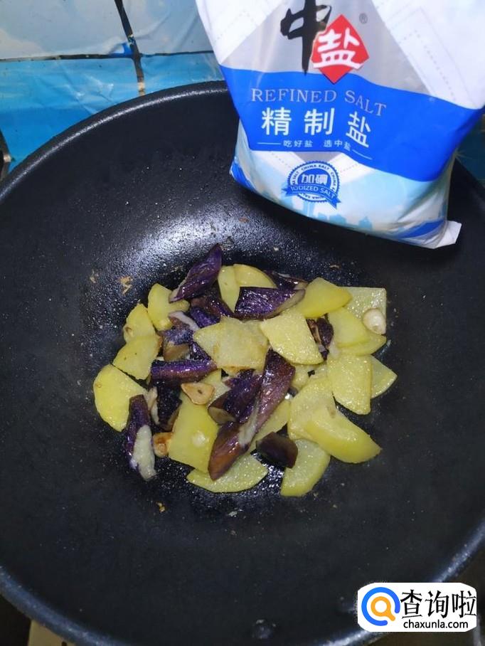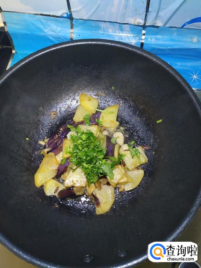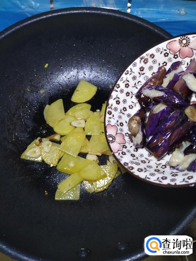 炒至土豆片微微变色之后,将准备好的茄子倒入锅中,翻炒均匀。