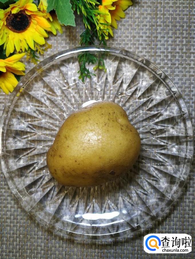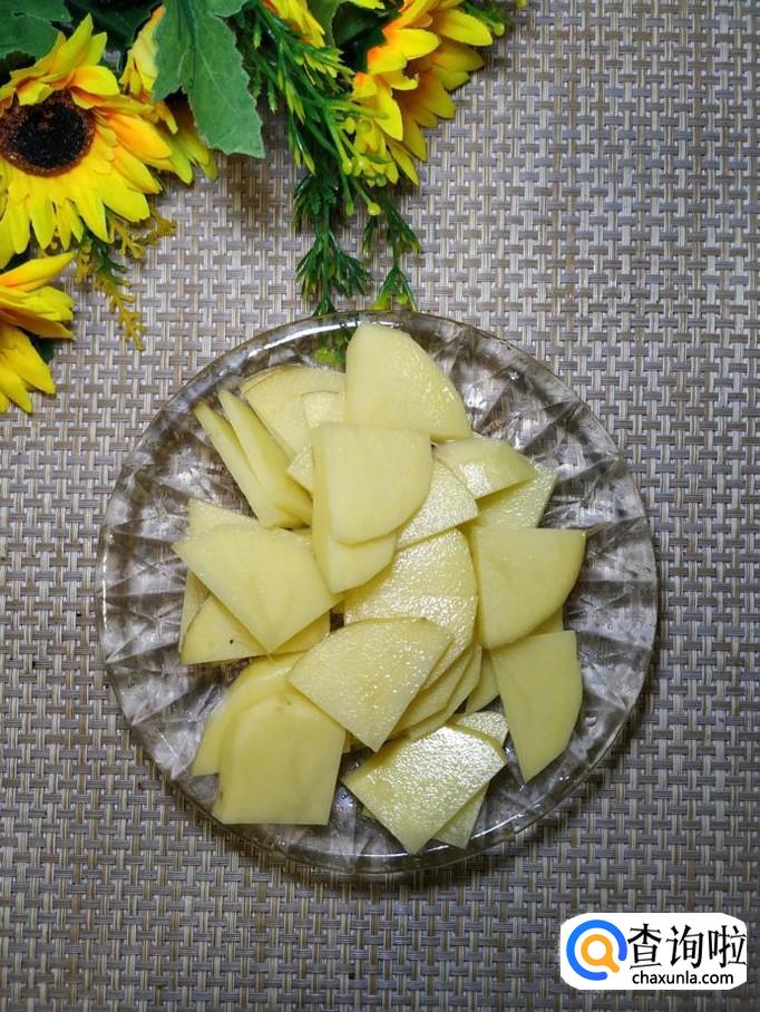 准备一个土豆,洗净后去皮,切成片,洗去淀粉,放入盘中备用。