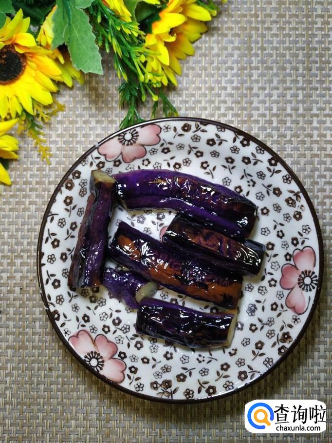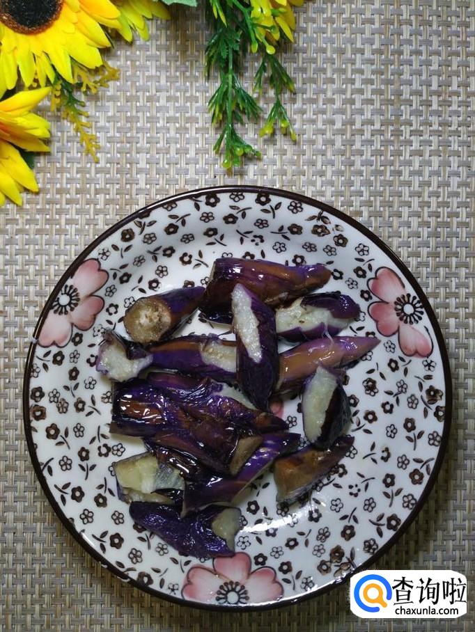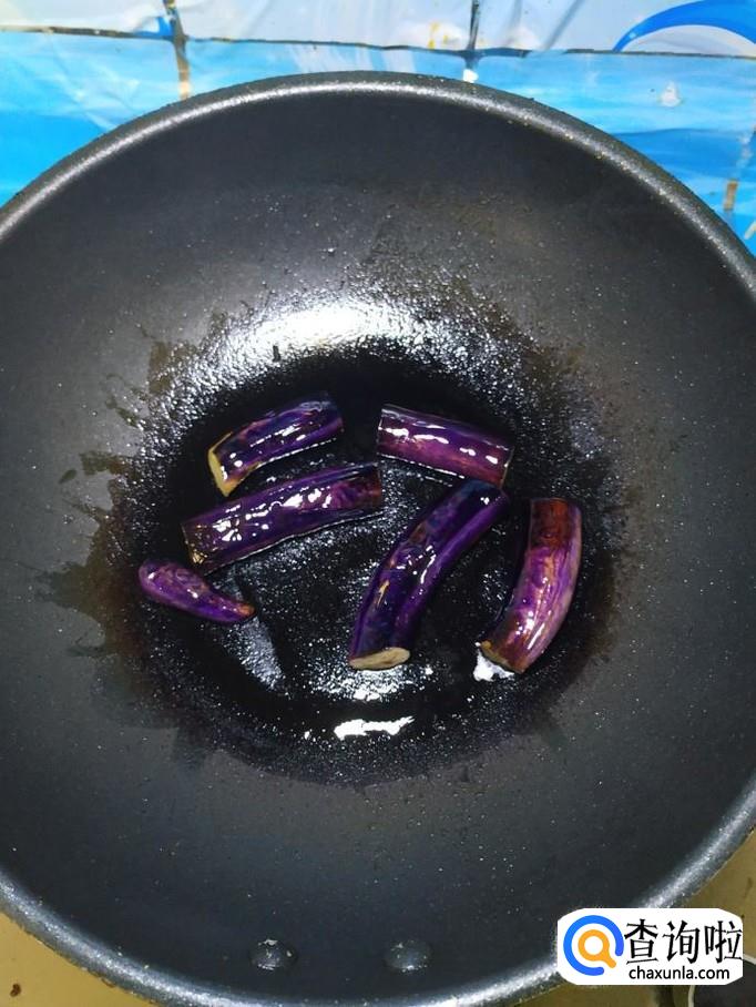 平底锅放入适量油,油热后将茄段放入锅中,小火慢煎,煎至表面发皱,切成滚刀块儿,放入盘中备用。