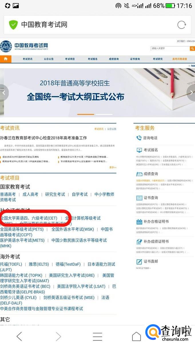 首先在浏览器页面搜索中国教育考试网,找到全国大学英语四六级考试的窗口,然后点击。