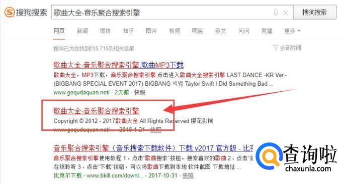 打开电脑,进入搜狗浏览器,搜索“歌曲大全-音乐聚合搜索引擎”,点击并进入。