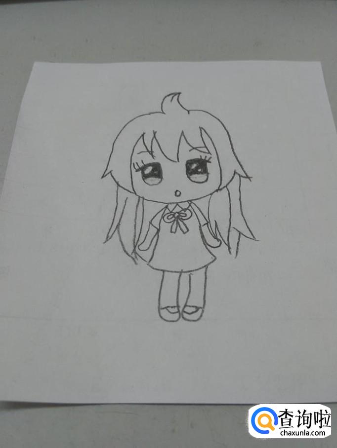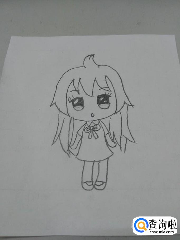 在裙子下面,再画两个粗一些的长条状,表示腿,在腿的末端各画一条线,在线下再画一条短弧线,表示鞋子,萌少女就画完了。