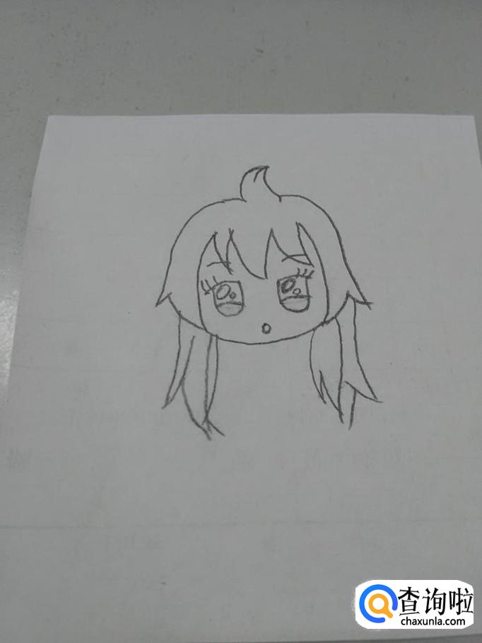 从第一层头发梢处,连接一条弧线,勾出脸型。圆圆的脸,才显得萌。