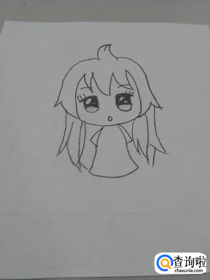 在脸上,画两条弧线,表示眉毛,再画两个椭圆形的眼睛,眼睛上方画成平的,表示眼眶,嘴则画成一个小圆圈,这样看着更萌。