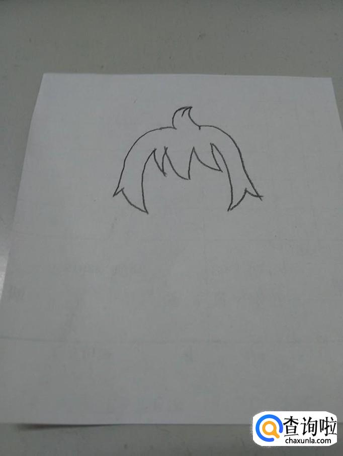 画动漫人物,可以先从头发画起,因为头发占画面的比例相当大,画好头发,脸型才能固定。所以,先画一个小火苗形状,这是少女头顶的一撮头发,然后向两侧画两条弧线,再从弧线往内侧,画出许多锯齿形状,两边长,中间短,表示少女的头发梢。这是第一层头发。