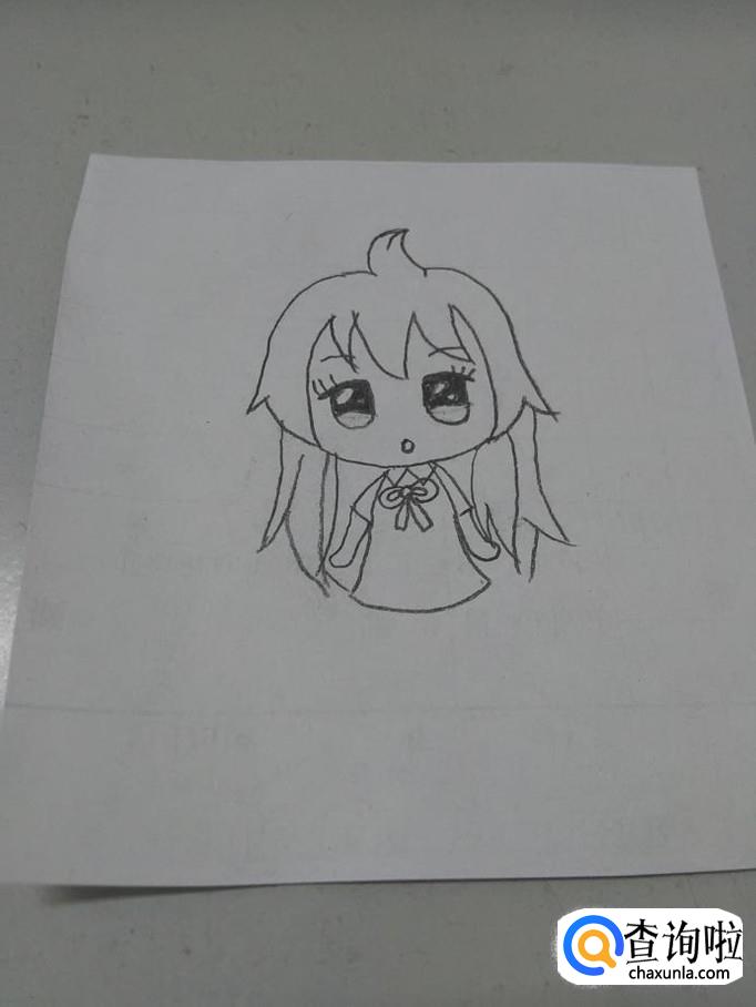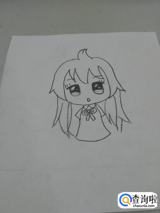 在头部下面,画一个钟的形状,两侧各画一个小三角形,表示裙子,头大身体小,这样看着才萌。