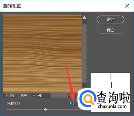 接下来我们整个画布选中,按快捷键ctrl+A即可,然后执行【滤镜】——【扭曲】——【旋转扭曲】命令,角度修改至15左右即可,大家也可以边调整边看预览图,觉得合适即可。