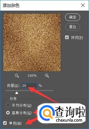 接着执行【滤镜】——【杂色】——【添加杂色】命令,将数值修改为20左右即可,选择高斯分布并且将单色勾选,参数及效果如下。