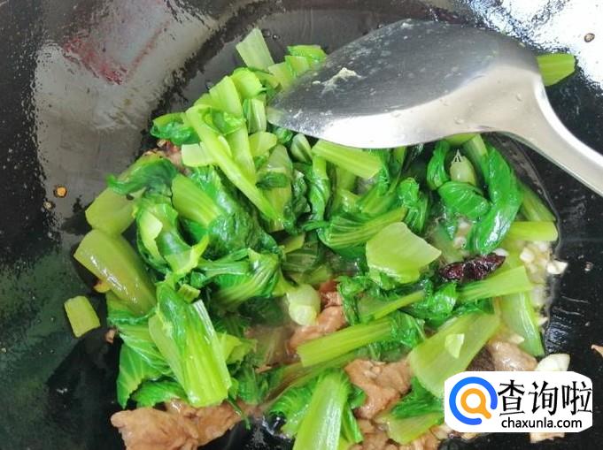 翻炒之后就可以加入焯过水的油菜,翻炒均匀放入适量食盐,焯水时油菜烫的断生的可以多翻炒会,因为家里有老人,我这油菜几乎烫熟了,所以稍微翻炒就可以。