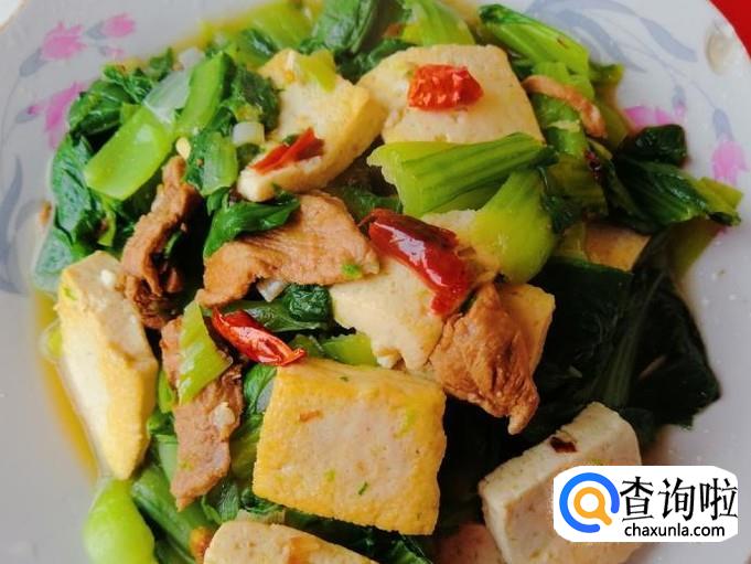 小油菜适量、400克豆腐、适量熟猪肉、干辣椒一个、葱一小段、少许姜。