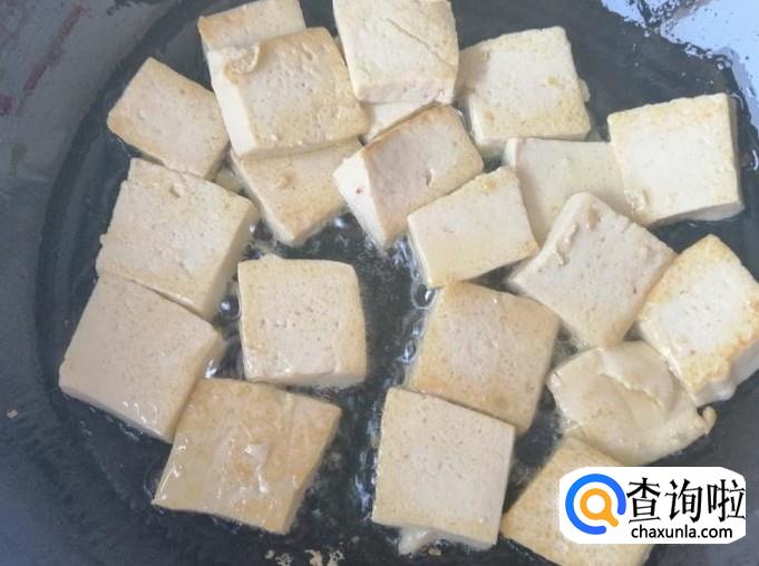 这一步主要是用油煎一下豆腐,防止炒的时候豆腐易碎。炒锅放适量油,油热后放进豆腐,改小火慢煎,如图煎至两面微黄就好,这样煎的豆腐比较嫩。